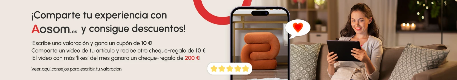 Las valoraciones de productos ayudan a otros clientes a elegir los productos más adecuados. Animamos a los clientes a proporcionar comentarios completos y honestos. Aquí tienes algunos consejos para que tus valoraciones sean lo más útiles posible para otros clientes: ¡Sé honesto! Queremos conocer tu opinión sincera sobre los productos que has comprado. Evalúa tu experiencia personal y describe cómo utilizaste el producto. Trata de ser lo más auténtico posible e incluye tanto los aspectos positivos como negativos del producto. Incluye vídeos y/o imágenes de tus productos Añadir vídeos o imágenes a tus valoraciones las hace mucho más creíbles y útiles. Al mostrar el producto en fotos o vídeos reales, demuestras que lo has usado de verdad y puedes compartir una opinión honesta sobre los puntos positivos y negativos. Además, las fotos y vídeos permiten ver el producto en acción y ofrecen una visión mucho más completa de sus características que solo el texto. Qué fotos puedes añadir a tu valoración: - Foto del producto completo: Muestra el producto en su totalidad, preferiblemente con un fondo limpio. - Fotos de los detalles: Muestra los detalles del producto, como el material y los acabados. - Fotos del producto en uso: Muestra el producto siendo utilizado en tu día a día. - Fotos para referencia de tamaño: Coloca el producto junto a un objeto común para que se perciba mejor su dimensión. - Fotos antes y después de la instalación: Si el producto requiere montaje o instalación, comparte imágenes comparativas del proceso. Qué vídeos puedes añadir a tu valoración: - Unboxing: Muestra tu primera reacción al abrir el paquete, incluyendo los accesorios y detalles del producto. - Instalación o montaje: Graba cómo instalas o montas el producto, para ayudar a otros clientes a ver si es fácil. - Uso real: Muestra el producto en uso diario; estos son los vídeos más útiles. - Decoración o exposición: Comparte cómo queda el producto en tu hogar o espacio, mostrando ideas de decoración. - Comparación: Si tienes un modelo anterior o de otra marca, haz una comparación simple y explica por qué prefieres este.