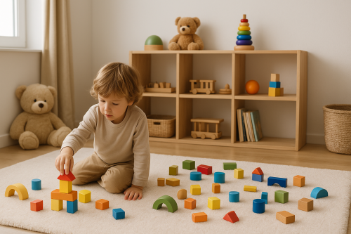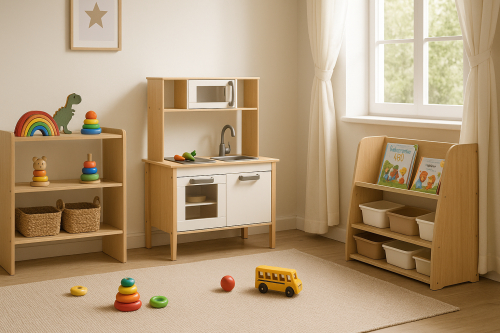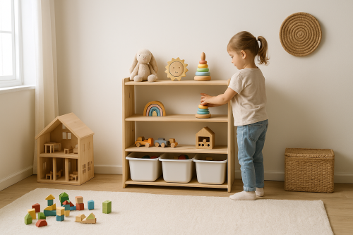 - Juguetes accesibles: almacenados en estanterías bajitas o cajas visualmente organizadas.
