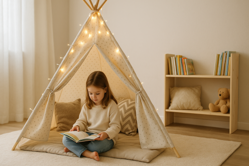 Este espacio favorece la lectura temprana, la autorregulación y el descanso emocional. Les ayuda a encontrar tranquilidad después de un día lleno de estímulos y a conectar consigo mismos.