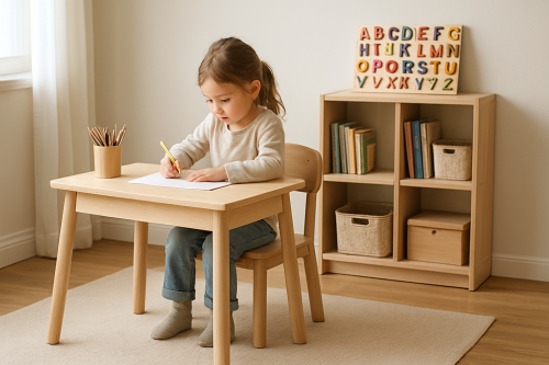 Rincón de estudio sencillo, primeros organizadores de escritorio, juegos de construcción más complejos.