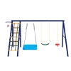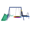 Conjunto de columpios multifuncional para exteriores con tobogán, trampolín, columpio redondo tipo nido y columpio de plástico, 333x198x183 cm, Azul antiguo