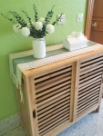 es una zapatera donde los zapatos entran defrente,no queria de esos que quedan inclinados.Al tener las lamas separadas,respira el calzado.Lo compré para la escalera para dejar los zapatos afuera.Es perfecto