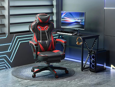 Una oficina gamer pensada para quienes pasan horas jugando: escritorio amplio para todos los equipos de gaming y silla ergonómica con soporte lumbar y de cabeza, ideal para largas partidas. Un espacio que combina estilo, confort y máxima diversión.