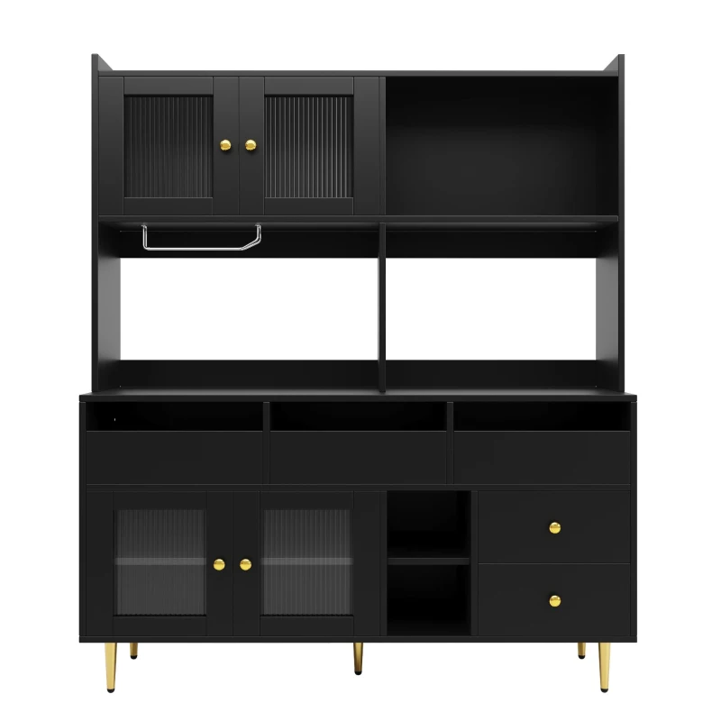 Armario alto para comedor, con puertas de cristal perforado, decoración dorada y amplio almacenamiento por niveles, 145x39x171 cm, Negro