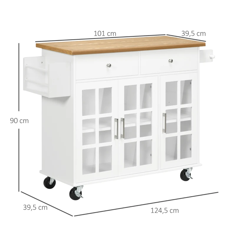 HOMCOM Carro de Cocina con Ruedas Isla de Cocina con 2 Cajones 3 Puertas de Vidrio Templado Toallero 124,5x39,5x90 cm Blanco