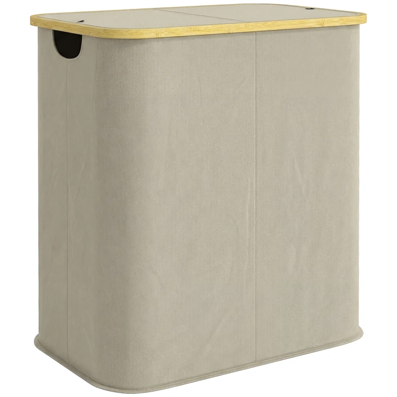 Simplifique la organización de la ropa con el cesto de ropa HOMCOM beige, 80 L dividido en dos compartimentos de 40 L para clasificar fácilmente. Diseñado en tejido no tejido y bambú, este cesto plegable y portátil es un complemento elegante para cualquier hogar.