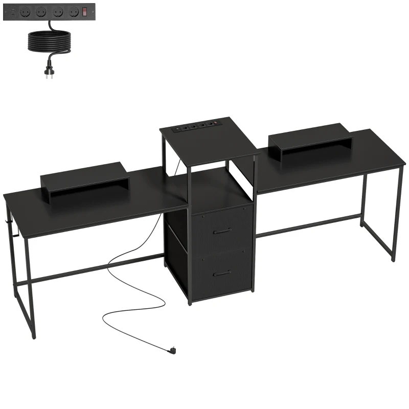 HOMCOM Mesa Gaming Doble de 244 cm con Estación de Carga Puertos USB Soportes para Monitor Cajones de Tela Negro(m-11)