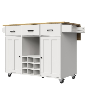Isla de cocina con tablero de mesa abatible, carrito de servicio con estantes para snacks y armarios extensibles, 134,5x46/74x90,5 cm, Blanco