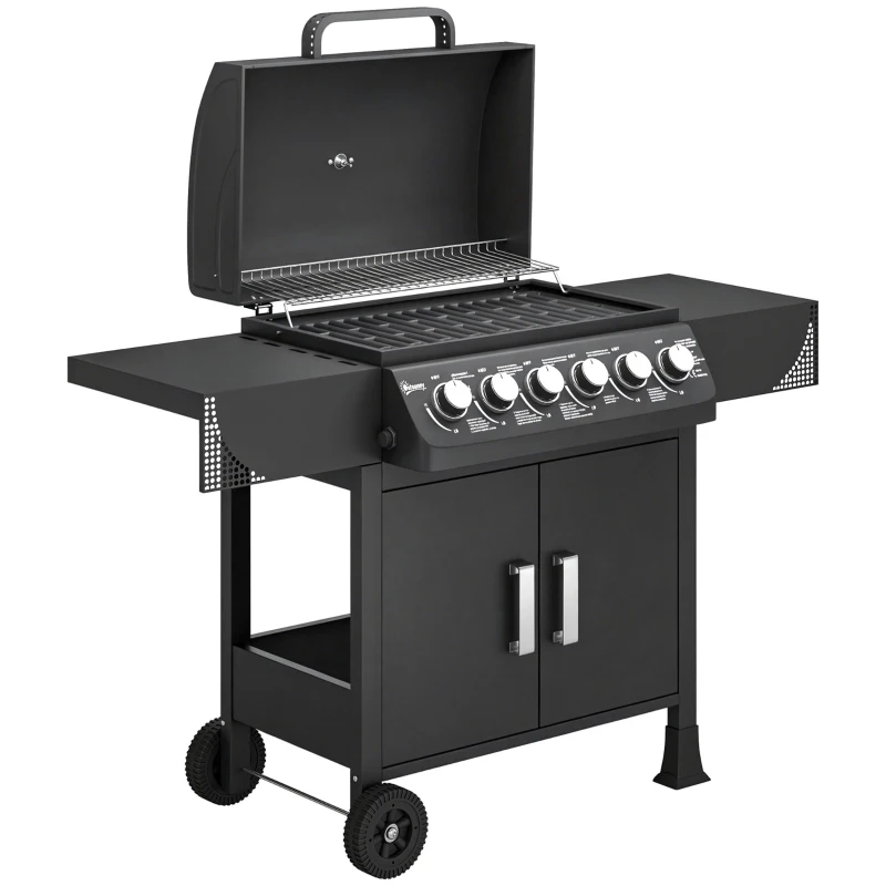 Outsunny Barbacoa de Gas con 6 Quemadores 15 kW Termómetro Parrilla Mesas Laterales Armario y Ruedas 135x51x101 cm Negro
