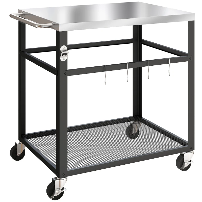 Outsunny Carrito de jardín para barbacoa con ruedas bandeja de acero inoxidable estante ganchos, 82 x 55 x 79 cm, negro