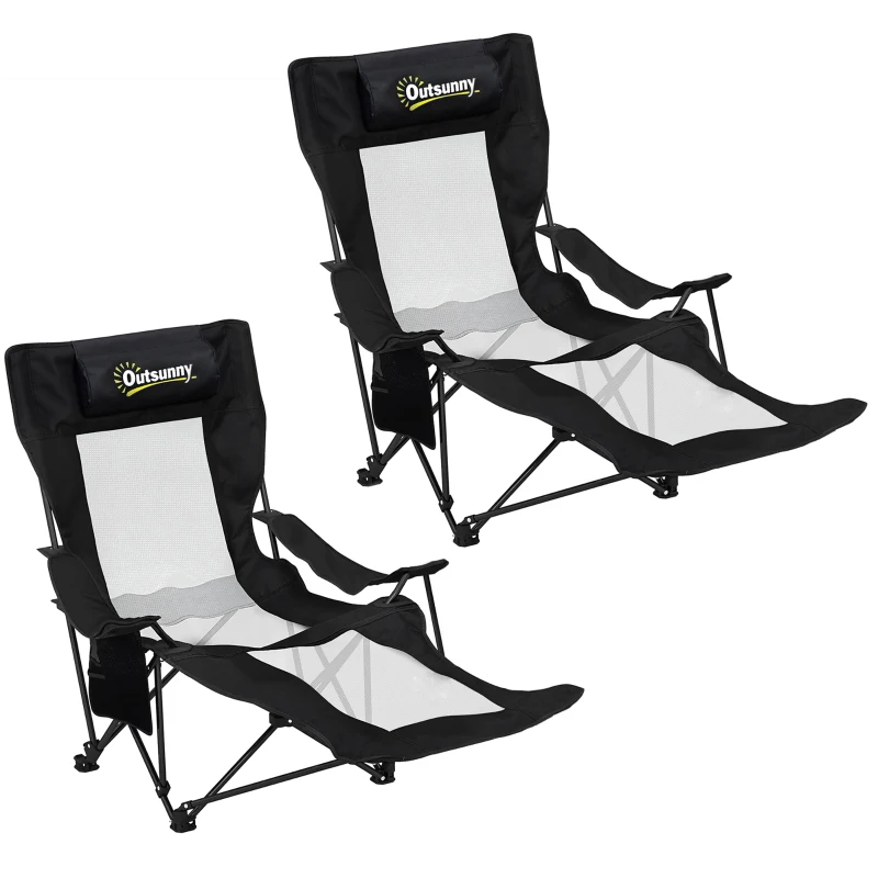 Outsunny Conjunto de 2 Sillas Plegables Camping Reclinables con Reposapiés Desmontable Reposacabezas Portavasos y Bolsa Negro