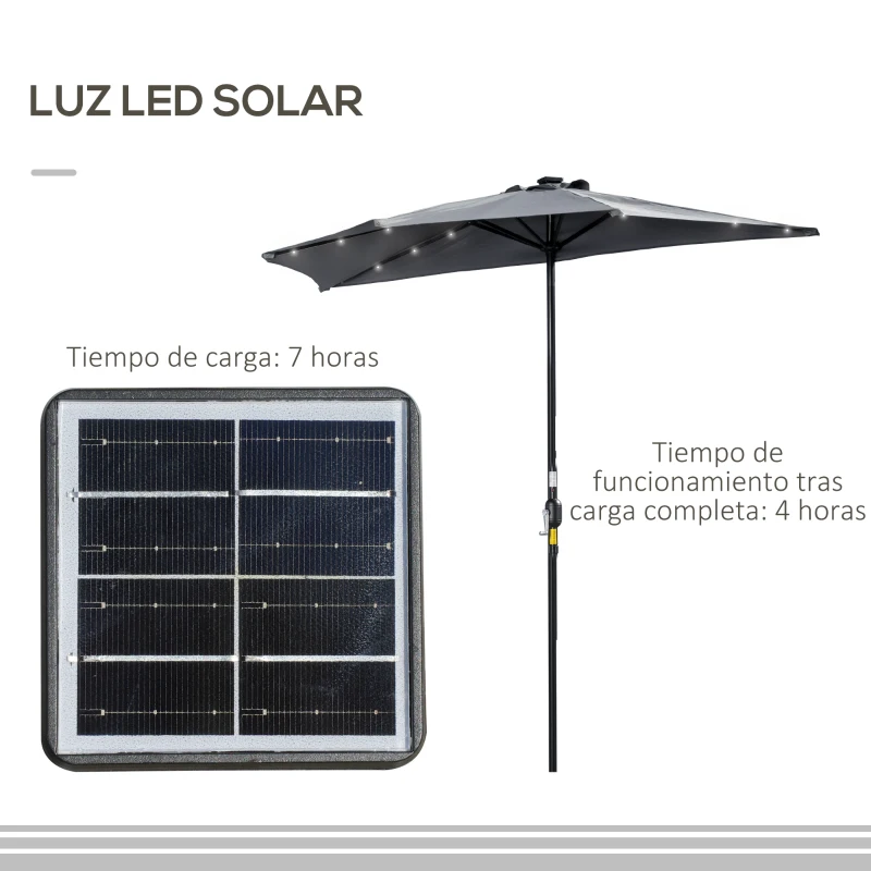 Outsunny Sombrilla de Jardín con 24 Luces LED Solar 270x135x240 cm Parasol Semicircular con Manivela para Balcón Terraza Gris