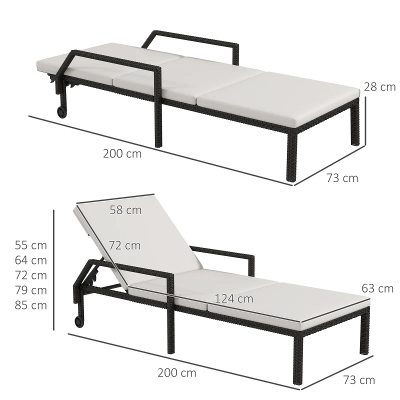 Outsunny Tumbona de Ratán Sintético con Respaldo Ajustable en 5 Posiciones Cojín y Ruedas 73x200x48 cm Crema y Negro