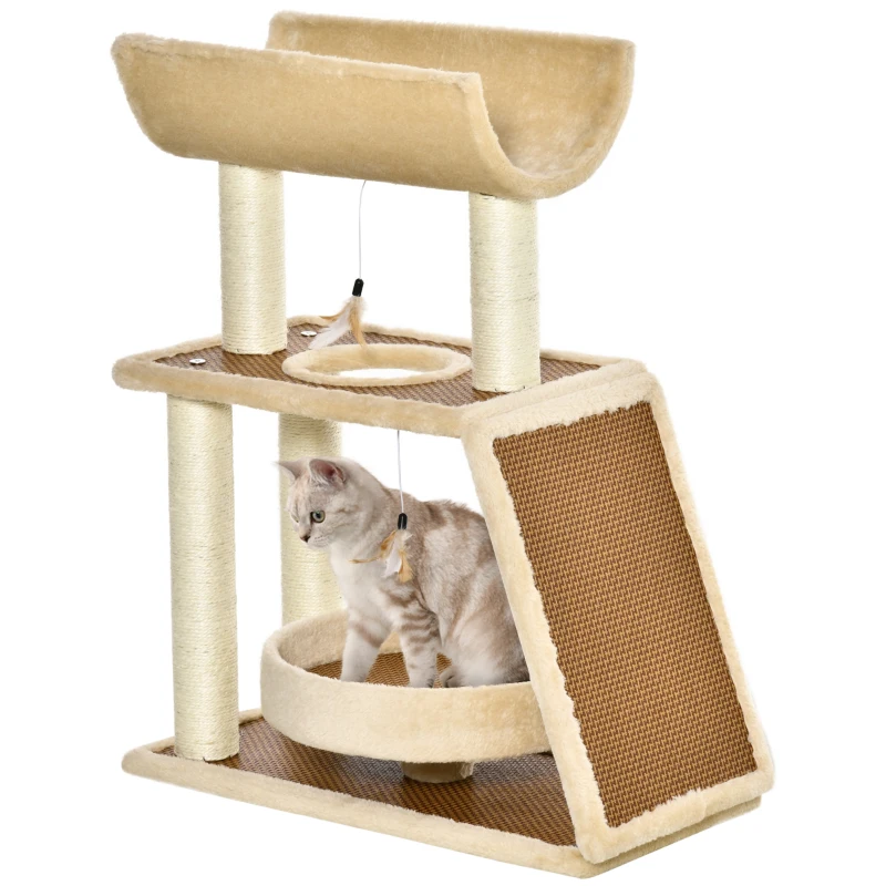 PawHut Árbol Rascador para Gatos 60x30x76 cm con Cama de Lino Postes Rascadores de Sisal Natural Plataforma Tipo Túnel Rampa y Juguetes Colgantes Beige y Marrón