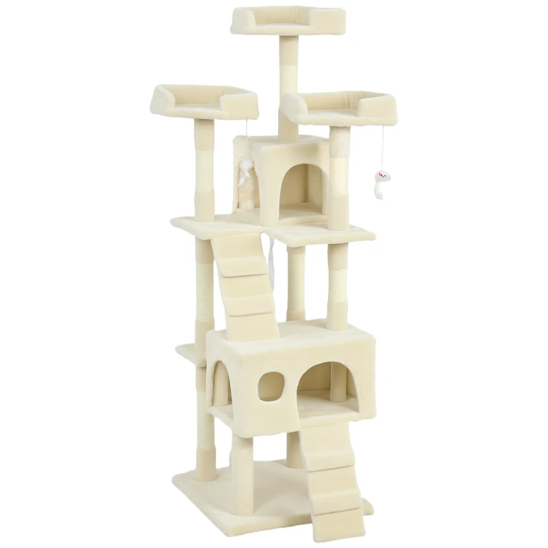 PawHut Árbol Rascador para Gatos Árbol para Gatos 153 cm con 2 Cuevas 3 Camas 2 Rampas Postes de Sisal Ratones Colgantes Crema