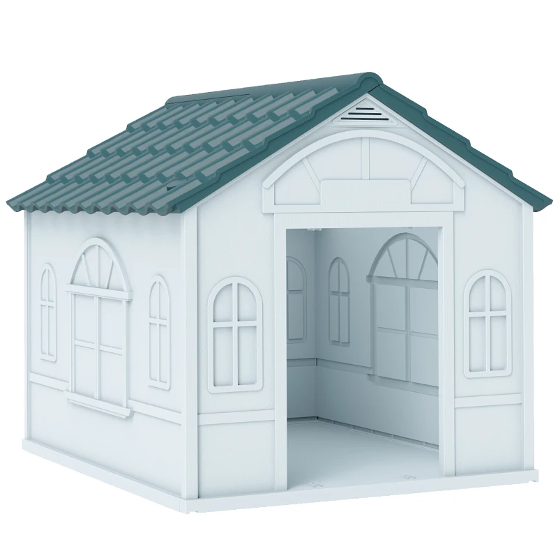 PawHut Casa para Perros con Imitación de Ventana y Tejas para Perros Medianos 65x75,7x63 cm Azul Verdoso y Blanco