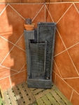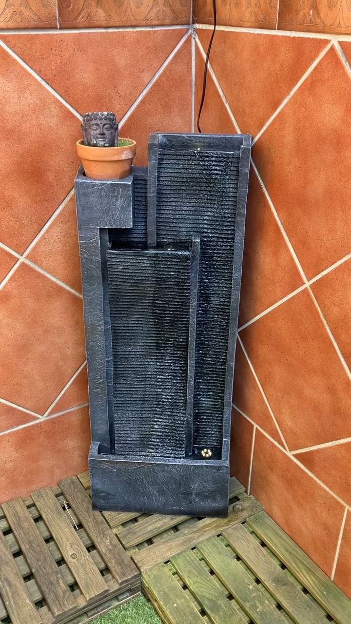 fuente de calidad con aspecto de piedra . buen flujo de agua y buena iluminación nocturna.
